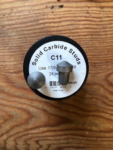 Foot Pro C11 Studs - 24 ct. jar. These are an all tungsten carbide stud for better wear. Use a 17/64" drill bit.